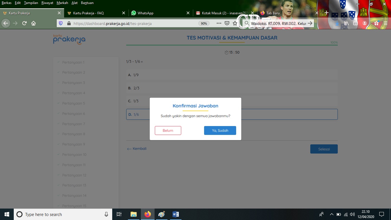 16. Jika telah selesai menjawab semua maka akan muncul kotak dialog konfirmasi seperti di bawah ini dan klik YA, SUDAH